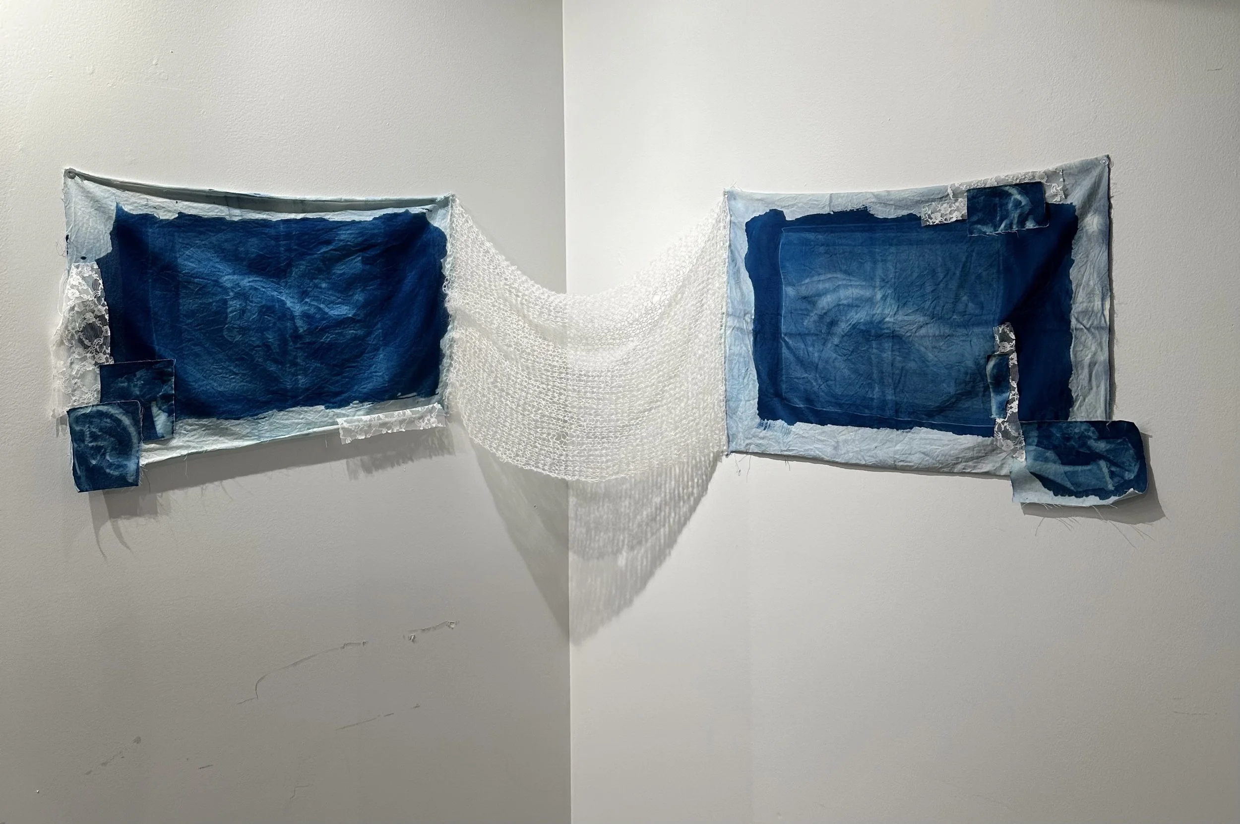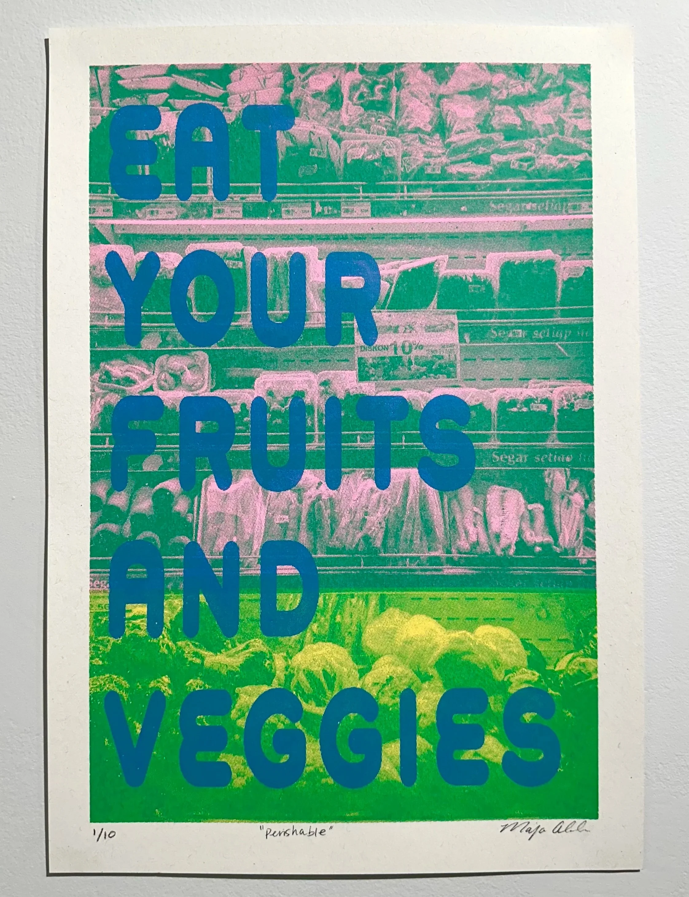 Maya Abraham’s work is highly interdisciplinary. It consists of relief prints, silkscreen, and textile. Her work includes intentional use of color and graphic imagery. She creates work as a way to express what she sees in my daily life. Mundane things that inspire her include daily routines, transit, and people in conversation. Observing human nature, especially as a collective, is what truly inspires her. A common theme in her work is distortion. Often she pulls previous photos that she has taken as inspiration and warp them in ways she finds compelling. For example, taking reflections of objects or people and exaggerating them. In her work, she has enjoyed using textile and these printmaking mediums because of the texture that they bring.